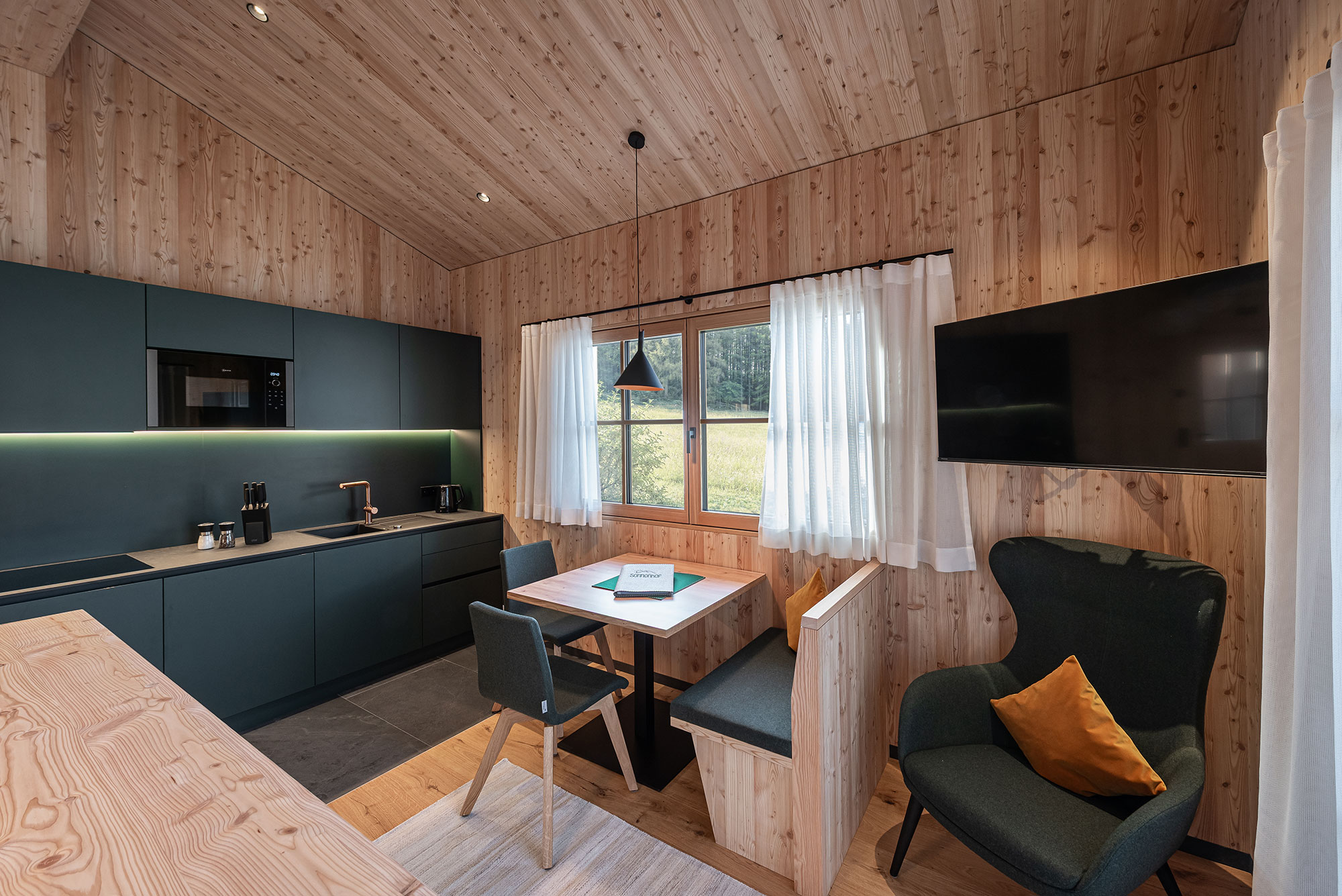 Willkommen in unserer liebevoll eingerichteten Ferienwohnung – ein stilvoller Rückzugsort für Erholung und Wohlfühlmomente. Der offene Wohn-, Schlaf- und Essbereich ist hell und großzügig gestaltet, mit hochwertigen Lärchenholzmöbeln und warmer Wandverkleidung, die alpinen Charme ausstrahlen. Der eigene Balkon bietet einen traumhaften Blick auf den Haidersee, die Berge und den Lärchenwald – ideal für entspannte Stunden mit Aussicht.